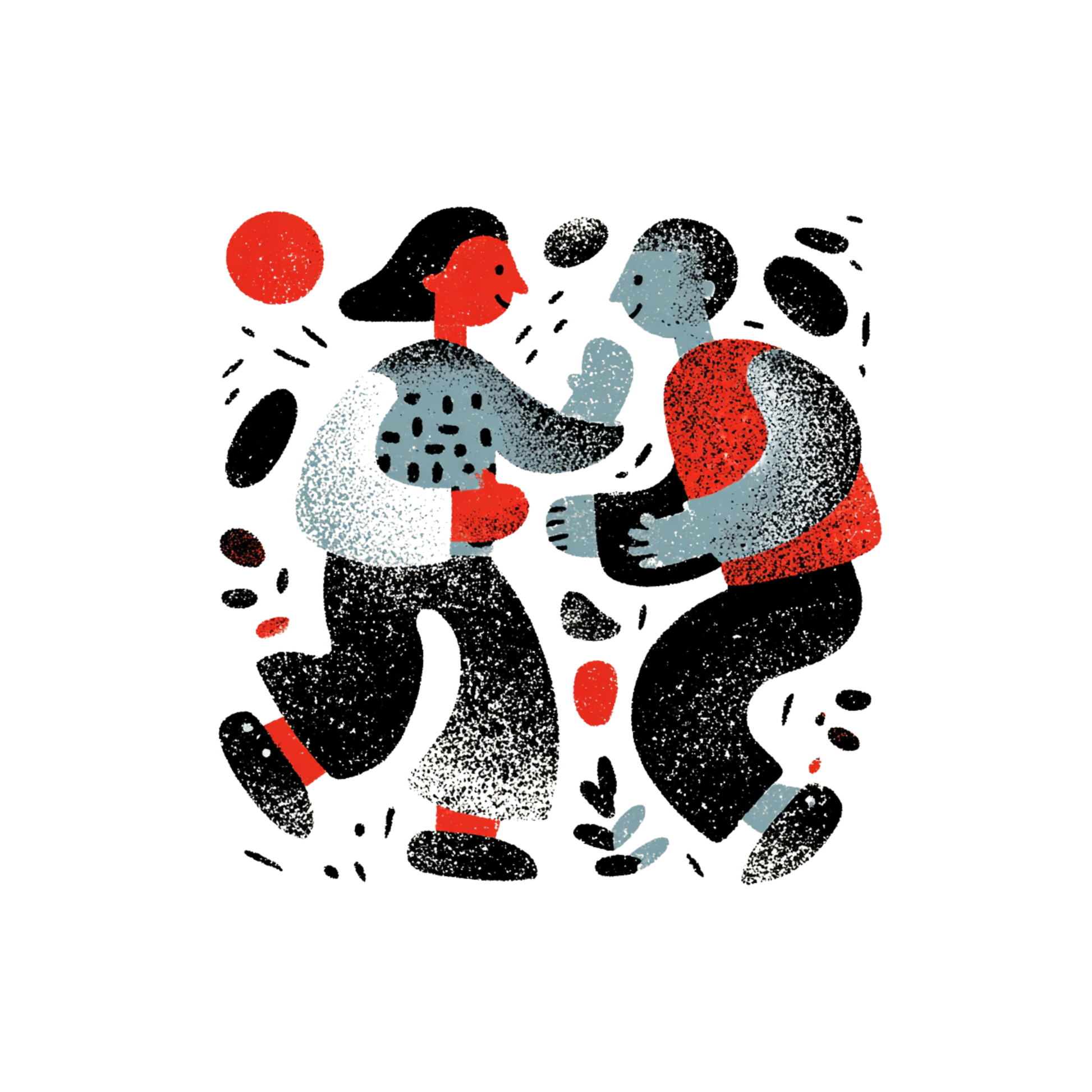 The piece uses a warm, earthy color palette combined with bold black line work to represent balance between structure and freedom. The figures interact in a subtle narrative, symbolizing connection, individuality, and shared creative energy. Each shape and mark contributes to a visual rhythm that invites viewers to interpret their own meaning.